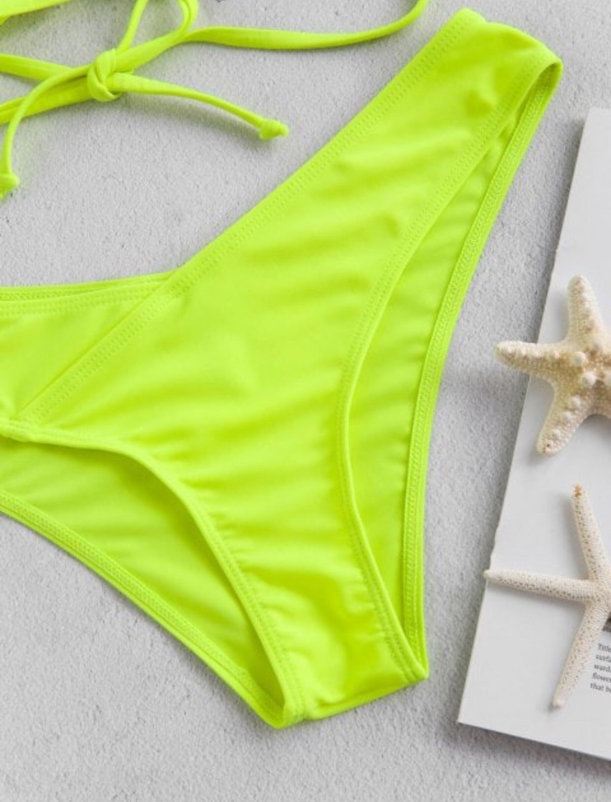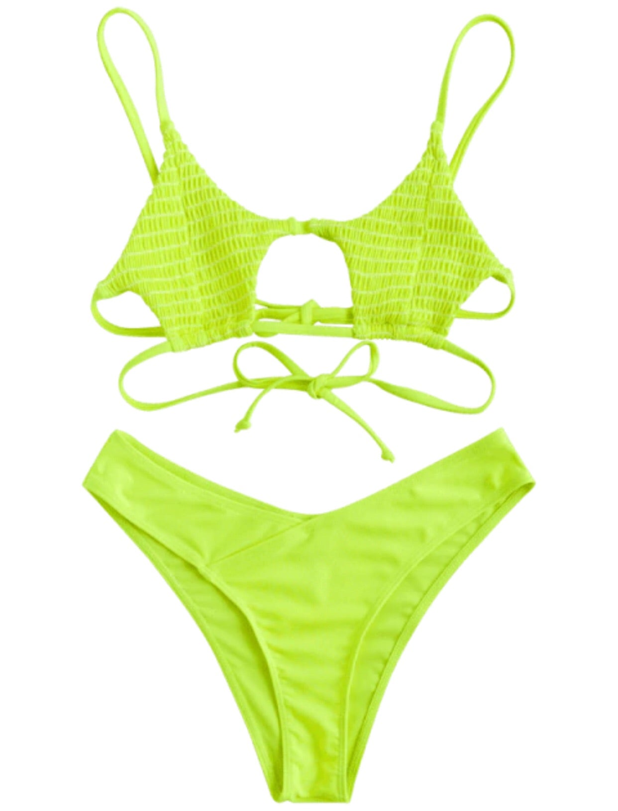 Stand out from the crowd in this neon bikini set. The bikini top is complete with a smocked body, cutout front, and duo tying back straps, as well as a pair of greatly shaped bottoms to accentuate that booty.